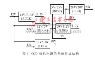 CCD 相機(jī)中的圖像信息的流動和變換是通過相機(jī)中的FPGA/CPLD時(shí)序發(fā)生器的驅(qū)動和MCU的控制管理下完成的。整個(gè)CCD相機(jī)正常工作需要以下6種穩(wěn)壓電源,它們的電壓值和最大輸出電流分別是:28V@30mA、20V@50mA、10V@100mA、5V@20mA、3.3V@300mA和1.2V@30mA。