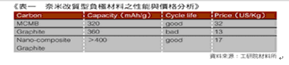 (表一) 納米改質(zhì)型負(fù)極材料之性能與價(jià)格分析