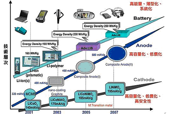 鋰二次電池雖然已廣泛使用于3C產(chǎn)品上,然而隨著筆記型電腦使用1GHz CPU而增加耗電量,以及LCD螢?zāi)怀叽缂哟?、解析度提高、使用高容量硬碟及DVD-ROM等趨勢(shì),未來(lái)筆記型電腦整體功率消耗明顯提高,因此對(duì)鋰電池主要的技術(shù)提升需求,包括提升電池能量密度、降低重量與智慧型電源管理。未來(lái)行動(dòng)電話從2G提升至3G時(shí),不論是GSM、WCDMA等系統(tǒng),所需要的電池能量密度都需要明顯的增加。目前薄型鋰電池系統(tǒng)的重量能量密度雖有顯著的提升,但主要是罐體外殼的輕量化,在電極材料的性能提升上,進(jìn)展較少。針對(duì)3G所強(qiáng)調(diào)的高體積能量密度>420 Wh/L要求,目前薄型鋰電池的體積能量密度(340~360 Wh/L)仍無(wú)法符合其規(guī)格目標(biāo)。未來(lái)各種多功能的手錶(Multifunctional Watch),將具有Phone、DSC、MP3等功能,此時(shí)對(duì)能量密度高且薄型化鋰電池的需求更加迫切,另一方面3G行動(dòng)電話與結(jié)合電腦、PDA、行動(dòng)電話等功能的行動(dòng)資訊與通訊終端產(chǎn)品(Mobile IA),將大量地被使用,對(duì)具有高能量密度的鋰電池同樣迫切需求,如(圖二)。因此開發(fā)高容量及高功率的納米級(jí)鋰電池材料,并應(yīng)用于新世代的納米鋰電池上,是全世界鋰電池業(yè)者目前最重要需突破的目標(biāo)。