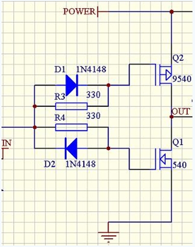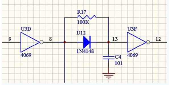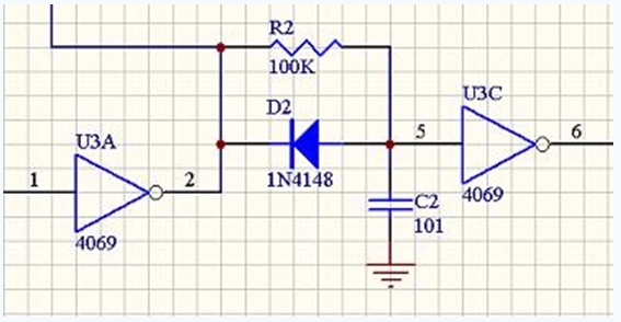 這個電路要求在IN端輸入的是邊緣陡峭的方波脈沖,因此控制信號從單片機或者其他開路輸出的設備接入后,要經(jīng)過施密特觸發(fā)器(比如555)或者推挽輸出的高速比較器才能接到IN端。如果輸入邊緣過緩,二極管延時電路也就失去了作用。