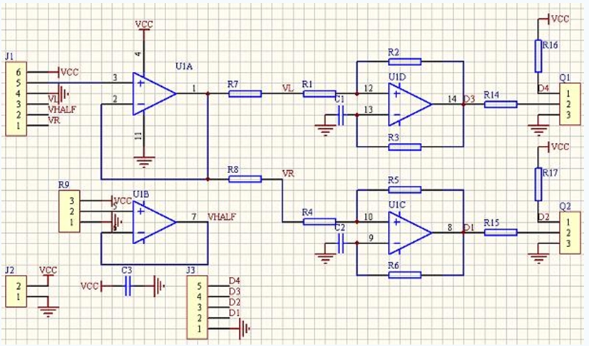 上圖為一個使用游戲手柄或者航模搖桿上的線性電位器(或線性霍爾元件)控制兩個底盤驅(qū)動電機的PWM生成電路。J1是手柄的插座,123和456分別是x,y兩個方向的電位器。U1B提供半電源電壓,U1A是電壓跟隨。x,y分量經(jīng)過合成成為控制左右輪兩個電機轉(zhuǎn)速的電壓信號。在使用中,讓L=(x+1)y/(x+1。4),R=(x-1)y/(x-0。6),經(jīng)過試驗有不錯的效果(數(shù)字只是單位,不是電壓值)。經(jīng)過U1C和U1D組成的施密特振蕩器把電壓轉(zhuǎn)換為相應的PWM信號,用來控制功率驅(qū)動電路。以U1D為例,R1,R2組成有回差的施密特電路,上下門限受輸入電壓影響,C1和R3組成延時回路,如此形成振蕩的脈寬受輸入電壓控制。Q1,Q2是三極管,組成反相器,提供差分的控制信號。具體振蕩過程參見對555振蕩器的分析。