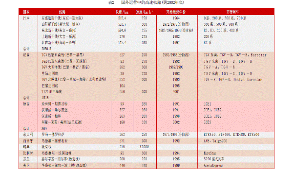 現(xiàn)在,越來越多的國家已經(jīng)擁有了或者正在或者準(zhǔn)備建設(shè)高速鐵路。截至2003 年底,世界上時(shí)速超過250km的高速鐵路運(yùn)營里程已達(dá)到5 900km,還有近3 000km高速鐵路在建。計(jì)劃到2015年,世界上擁有高速鐵路的國家和地區(qū)將達(dá)到23個(gè),總里程會(huì)達(dá)到30 000km,歐洲地區(qū)將形成高速鐵路網(wǎng)聯(lián)通。表2所列的是到2002年底國外正在運(yùn)營的高速鐵路概括。