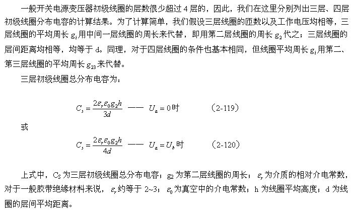 當變壓器的線圈為多層時,我們只需反復利用(2-117)式來對相鄰兩層之間的分布電容獨立進行計算,然后把結(jié)果相加即可。如果一定要寫出計算多層線圈分布電容的表達式,則變壓器多層線圈的分布電容可表示為: