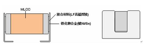 金屬端子通過接合材料(LF高溫焊接)與電容器的外部電極相結(jié)合,使金屬端子成為接合電路板的媒介。金屬端子的形狀采用能夠降低嘯叫效果的U字形。它只是與電容器上壓電效應(yīng)比較小的WT面外側(cè)部分結(jié)合,從而減低電容器振動的傳遞。