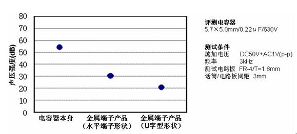 針對單個電容器的嘯叫,金屬端子電容器能夠大幅度的降低嘯叫強度。另外,若與使用低介電率材料的陶瓷電容結(jié)合,能更進一步降低嘯叫強度。