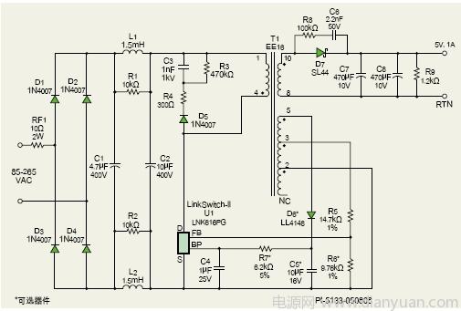圖2是一款5W通用輸入恒壓/恒流(CV/CC)充電器/適配器的電路設計圖。本設計適用于手機電池充電器、USB充電器或任何有恒壓/恒流特性要求的應用。該電路可為最高1A的負載提供5V恒流輸出,精度為±5%。當需要更大負載時,電源將進入恒流模式,輸出電壓降低,使輸出電流維持在1A±10%。