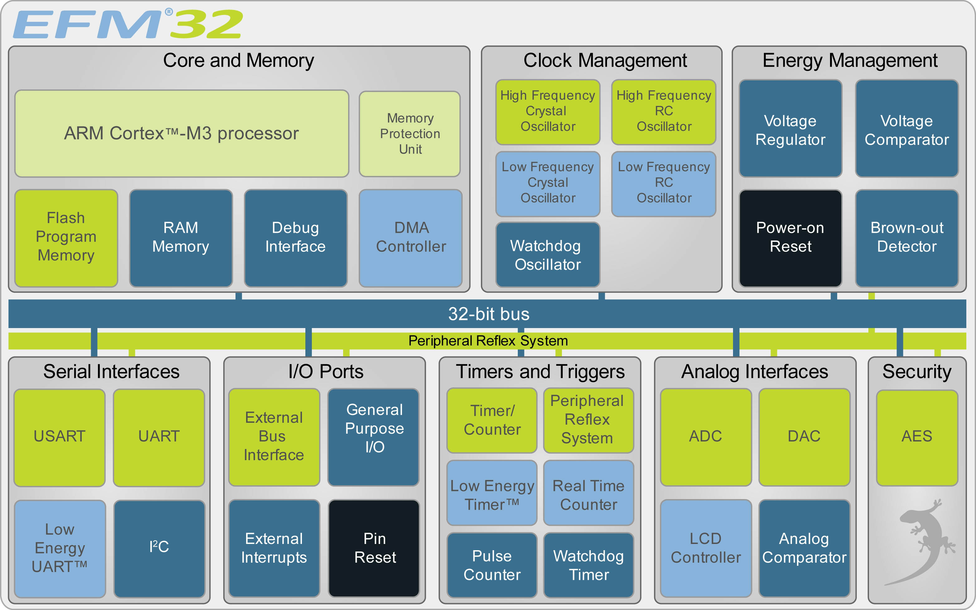 一體化是限制電源的一個(gè)重要因素。由于一整套片上外圍設(shè)備,Gecko CPU形成了一個(gè)有絕對最低的外部元件的系統(tǒng)基礎(chǔ)。其內(nèi)核包括片上閃存(達(dá)128 KB)和RAM(達(dá)16 KB),有1系列的串行接口包括UART(標(biāo)準(zhǔn)和低功耗),USARTs和 I2C,其多個(gè)數(shù)字I / O達(dá)到了90個(gè)引腳;幾個(gè)不同的定時(shí)器/計(jì)數(shù)器模塊也將產(chǎn)生PWM輸出,而模塊包括模擬/數(shù)字和數(shù)字/模擬轉(zhuǎn)換器。其它的片上硬件不僅包括一個(gè)用來直接驅(qū)動(dòng)1個(gè)4x40段顯示器的LCD控制器模塊,也包括一個(gè)為AES加密的加速功能。