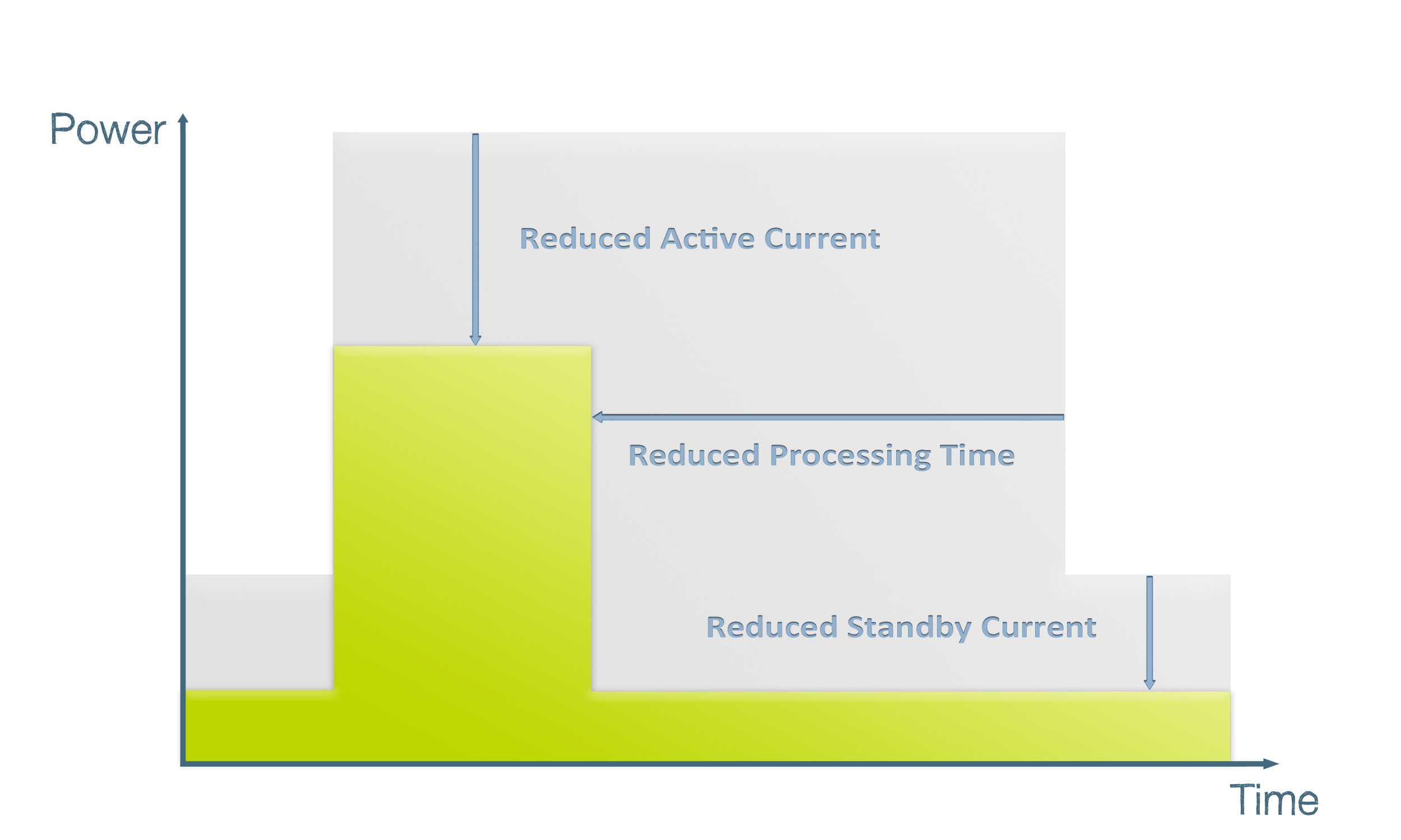 圖2. 一個(gè)節(jié)能MCU內(nèi)核可通過完整的喚醒/操作/返回睡眠周期節(jié)省幾個(gè)不同區(qū)域的能量。藍(lán)色區(qū)域表示一個(gè)更強(qiáng)大的32位內(nèi)核完成任務(wù)所節(jié)省的能量,所需的周期比一個(gè)8位內(nèi)核需要的少,在活躍和睡眠模式下消耗的電流也較少。
