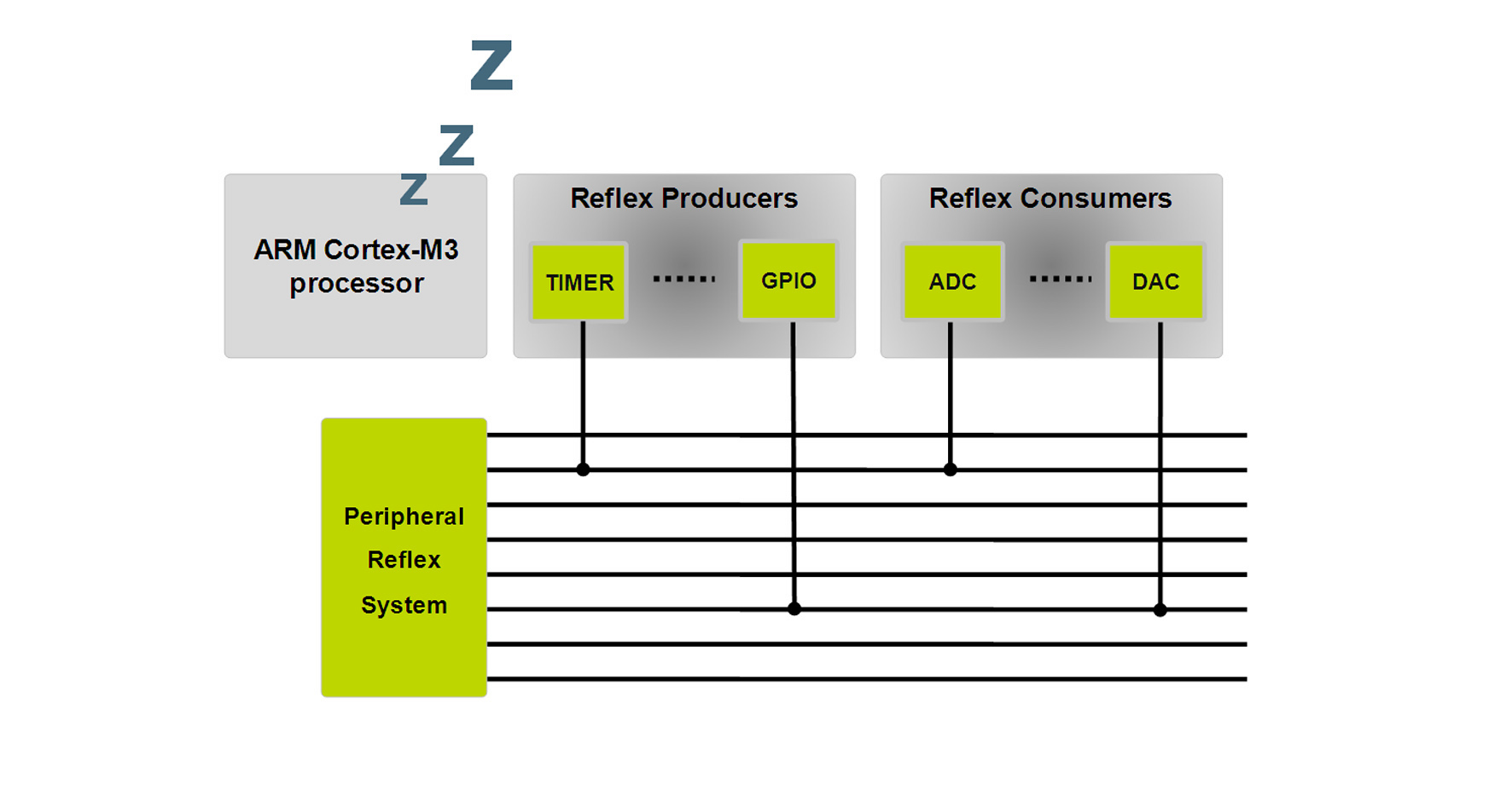 盡管有一個(gè)高效的32位處理器內(nèi)核資源,Energy Micro公司的設(shè)計(jì)人員認(rèn)識到在典型應(yīng)用中還有很多功能沒有達(dá)到全面的處理能力,如果在待機(jī)狀態(tài)下,即使是最節(jié)能的內(nèi)核也會(huì)使用較少的電源。和標(biāo)準(zhǔn)的32位一樣,ARM架構(gòu)總線與芯片上所有的功能性模塊互聯(lián),一個(gè)輔助總線或互連矩陣被稱為外圍設(shè)備反射系統(tǒng)。如圖4所示,使用該互連,外圍設(shè)備就能從ARM內(nèi)核中與外圍設(shè)備溝通,無任何干擾。