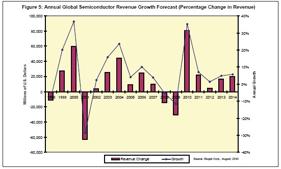2010年銷售額增幅將達807億美元,這將是半導(dǎo)體產(chǎn)業(yè)有史以來最大的年度銷售額增幅。相比之下,第二大增幅略低于600億美元,那是在網(wǎng)絡(luò)泡沫時期的2000年創(chuàng)下的紀(jì)錄。