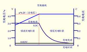 動(dòng)力電池組充電模式采用“恒流―恒壓”兩階段充電模式。充電開始階段,一般采用最優(yōu)充電倍率(鋰離子電池為0.3C)進(jìn)行恒流充電。(C是電池的容量,如C=800mAh,1C充電率即充電電流為800mA)在這一階段,由于電池的電動(dòng)勢(shì)較低,即使電池充電電壓不高,電池的充電流也會(huì)很大,必須對(duì)充電電流加以限制。所以,這一階段的充電叫“恒流”充電,充電電流保持在限流值。隨著充電的延續(xù),電池電動(dòng)勢(shì)不斷上升,充電壓也不斷上升。當(dāng)電池電壓上升到允許的最高充電電壓時(shí),保持恒壓充電。在這一階段,由于電池電動(dòng)勢(shì)還在不斷上升,而充電電壓又保持不變,所以電池的充電流呈雙曲線趨勢(shì)不斷下降,一直下降到零。但在實(shí)際充電過(guò)程中,當(dāng)充電電流減小到0.015C時(shí),說(shuō)明充電已滿就可停止充電。這一階段的充電叫“恒壓”充電,這一階段的充電電壓:U=E+IR為恒壓值。這是鋰離子動(dòng)力電池組對(duì)充電模式的基本要求。此外,充電系統(tǒng)還必須具有自動(dòng)調(diào)節(jié)充電參數(shù)、自動(dòng)控制和自動(dòng)保護(hù)功能。尤其在恒壓充電階段,如果單體電池的充電電壓超過(guò)允許的充電電壓時(shí),充電機(jī)應(yīng)能自動(dòng)減小充電電壓和電流,使該電池的充電電壓不超過(guò)允許的充電電壓,防止該電池過(guò)壓充電。充電過(guò)程及充電電壓、電流的變化如圖1所示。