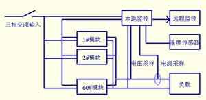 大功率電動(dòng)汽車充電機(jī)的輸入為額定線電壓380V、50Hz的三相交流電,輸出額定電壓700V,額定電流600A。系統(tǒng)采用19"標(biāo)準(zhǔn)機(jī)架,結(jié)構(gòu)緊湊、布局合理、外型美觀大方。外型尺寸:高×寬×深為2200mm×600mm×600mm。采用60個(gè)模塊并聯(lián),每個(gè)模塊10A/700V,模塊尺寸:高×寬×深為133mm×425mm×270mm,15層4列,分四個(gè)柜體安放,四個(gè)柜體可分開運(yùn)輸,使用時(shí)緊湊左右排列。機(jī)架前門、后門均為雙開門,方便檢修。電源進(jìn)線和匯流排輸出位置均在底部輸入。電源輸入斷路器及監(jiān)控單元觸摸屏安裝在主機(jī)中間控制柜前部。充電機(jī)控制結(jié)構(gòu)示意圖如圖2所示。