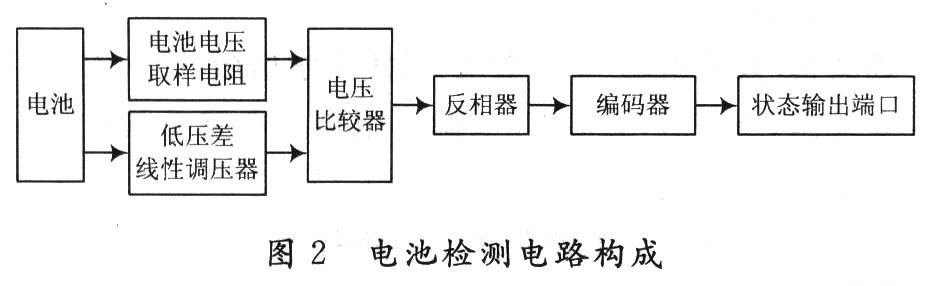 電池檢測模塊通過對供電電源輸出電壓取樣來判斷蓄電池的電量是否充足。在此將電源輸出電壓劃分為:25 V以上為電池電量滿狀態(tài)、24.2~25 V為電池電量充足狀態(tài)、23.5~24.2 V為電池正常工作狀態(tài)、22.8~23.5 V為電池電量不足但尚能工作狀態(tài)、22.8 V以下為電池不能正常工作狀態(tài)5個狀態(tài),通過狀態(tài)讀取來判斷電池能否正常為整個系統(tǒng)供電,決定是否為電池充電,以保證整個系統(tǒng)的正常運行。該模塊電路結(jié)構(gòu)如圖2所示。