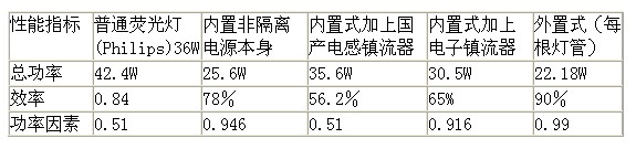 也就是說,直接替換的結(jié)果是效率大大降低,對于國產(chǎn)電感鎮(zhèn)流器,效率只有56.2%。只比普通熒光燈節(jié)電6.8W。