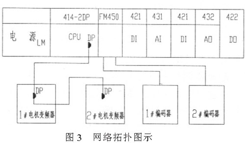 采用PLC 與變頻器控制方法, 實現(xiàn)多個分散驅動電機同步運行。PLC 采用西門子S7400 系列, 圖3為網(wǎng)絡拓撲圖。