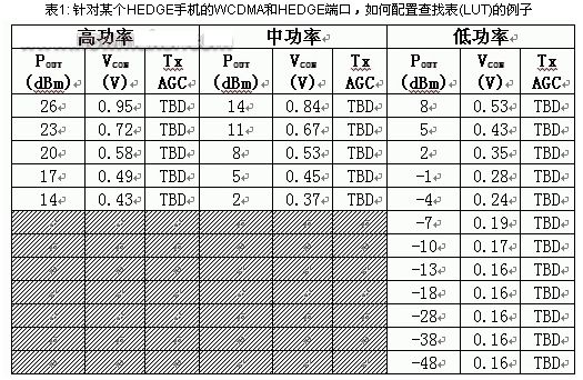表1所示為針對(duì)某個(gè)HEDGE手機(jī)的WCDMA和HEDGE端口,如何配置查找表(LUT)的例子。該表格針對(duì)Avago的3G功率放大器,分為高、中和低功率模式三個(gè)主要部分。其它功率放大器因結(jié)構(gòu)不同而具有不同的設(shè)置。高、中和低功率模式分區(qū)下各列內(nèi)容為該模式下的輸出功率及其相應(yīng)的VCON 電壓,這些電壓是基帶處理器生成的電壓,通知FAN5904為功率放大器提供正確的輸出電壓,獲得特定的輸出功率。GSM和EDGE則需要不同的查找表。