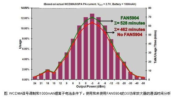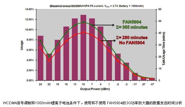 圖1和圖2顯示了在不同輸出功率條件下一個(gè)3G PA分別在語音和數(shù)據(jù)傳輸模式下有、無FAN5904時(shí)所使用的工作時(shí)間的分析。在PA電源電壓設(shè)定在鄰近信道功率比(ACPR)為-39dBc時(shí)的值時(shí), WCDMA的ACPR可以改善到-43dBc,但是電流消耗將會(huì)增加,導(dǎo)致效率降低。