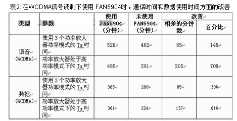 表2顯示了圖1和圖2的結(jié)果,以及功率放大器只工作于高功率模式下相應(yīng)的分鐘數(shù)。在HSUPA、CDMA200 1x EV-DO和TD-SCDMA等不同信號(hào)調(diào)制模式下,電流消耗和通話時(shí)間都有類似的改善。這里把高功率模式工作的通話/數(shù)據(jù)使用時(shí)間一起顯示的原因是:新技術(shù)不僅得到了更多的分鐘數(shù),從設(shè)計(jì)角度來看,亦簡化了校準(zhǔn)工作。當(dāng)功率放大器具有多種功率模式時(shí),固件必需適應(yīng)何時(shí)從一個(gè)等級(jí)切換到下一個(gè)等級(jí),因?yàn)樵谡麄€(gè)輸出功率范圍內(nèi),每個(gè)功率放大器的每種功率模式都存在獨(dú)特的VPA-POUT 曲線。由于現(xiàn)在大多數(shù)手機(jī)都支持至少三個(gè)頻段,這意味著滿足要求的系統(tǒng)中可能有三種3G功率放大器,所以增加了復(fù)雜程度。在處于一種功率模式的功率放大器中使用FAN5904,可以消除模式切換帶來的復(fù)雜性,更快地進(jìn)行功率放大器校準(zhǔn),因?yàn)樾枰男?zhǔn)點(diǎn)較少。這樣就縮短了測試/校準(zhǔn)的時(shí)間,并且降低了制造成本,同時(shí)簡化了設(shè)計(jì)過程。