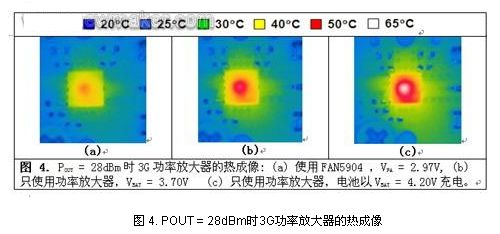 一個(gè)時(shí)常被忽視,但經(jīng)常遭到抱怨的參數(shù)是耗熱問題。在手持電話貼近頭部進(jìn)行通話,使用手機(jī)網(wǎng)上沖浪或者玩在線網(wǎng)絡(luò)游戲時(shí)手機(jī)發(fā)熱,大多數(shù)用戶會(huì)因此而感到煩惱。問題的關(guān)鍵在于,設(shè)計(jì)人員在設(shè)計(jì)手機(jī)時(shí)必需將這一因素考慮在內(nèi)。圖4所示為某3G功率放大器的熱成像,其中,(a)為使用FAN5904來供電;(b)為直接與電池連接;(c)為電池以4.2V電壓充電。使用FAN5904時(shí),在滿輸出功率情況下,功率放大器的溫度幾乎不可能達(dá)到50?C,在(b)和(c)的情況下,溫度很容易達(dá)到50?C和65?C,使用一段時(shí)間后,手機(jī)會(huì)很快發(fā)熱。在數(shù)據(jù)卡應(yīng)用中,尤其是3G USB調(diào)制解調(diào)器卡開始流行,熱耗散,或者說實(shí)現(xiàn)熱耗散最小化變得十分重要。USB卡不能像手機(jī)那樣有效地散熱,因?yàn)樗捏w積非常小。由于3G調(diào)制解調(diào)器主要用于數(shù)據(jù),功率放大器在大部分時(shí)間運(yùn)行于“發(fā)熱”狀態(tài)。減少這種熱量的最有效方式是使用諸如FAN5904的降壓轉(zhuǎn)換器。