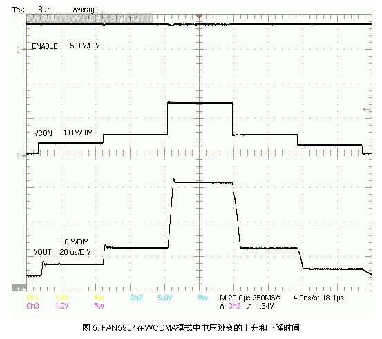 另一個(gè)常常被遺忘的參數(shù)是瞬態(tài)響應(yīng)時(shí)間。當(dāng)需要在不同電壓之間進(jìn)行跳變,以便為功率放大器提供合適的輸出功率時(shí),對(duì)各種無線協(xié)議而言,瞬態(tài)響應(yīng)時(shí)間變得尤為重要。FAN5904以6MHz的頻率進(jìn)行切換時(shí),具有非常短的10?s響應(yīng)時(shí)間 (如圖5所示),完全滿足時(shí)隙間隔為25?s的WCDMA規(guī)范和IOPC 6.4.2規(guī)范要求。