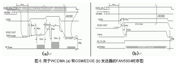 在輸出功率需要從低水平變到高水平,或者從啟動(dòng)開始,瞬態(tài)響應(yīng)時(shí)間為10?s。對(duì)于降壓穩(wěn)壓器而言,關(guān)鍵是使功率放大器滿足這些規(guī)范要求,避免出現(xiàn)通話中斷或者通話語音質(zhì)量不良的情況。由于用戶在不同的區(qū)域移動(dòng),信號(hào)覆蓋情況或好或壞,雖然如此,通話中斷現(xiàn)象是用戶所不能容忍的。對(duì)于GSM/EDGE模式,F(xiàn)AN5904能夠在5?s內(nèi)完成電壓之間的跳變,滿足GSM規(guī)范。圖6所示為用于WCDMA和GSM /EDGE發(fā)送器的FAN5904時(shí)序圖。