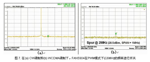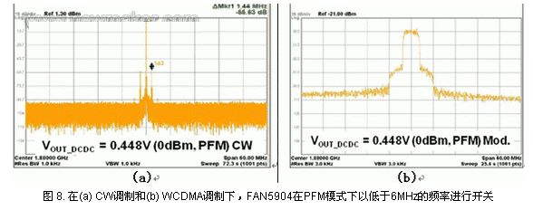 或許在PFM模式下,我們更加關(guān)注的是尖刺會(huì)在哪里進(jìn)入信號(hào)調(diào)制。通過進(jìn)一步查看圖8(a),在CW模式中,尖刺仍然在-40dBc以下,在8 (b)中,更重要的是該尖刺處于WCDMA調(diào)制遮蔽之下。