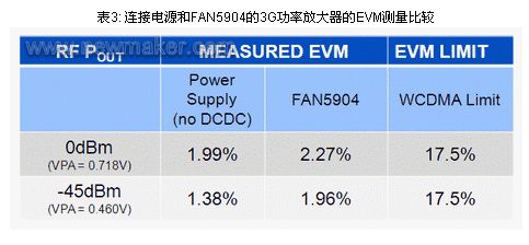 表3列出了所測量的0dBm 和-45dBm (圖8中VPA 值接近VOUT_DCDC )輸出功率的EVM,比較使用電源和FAN5904為3G功率放大器供電的情況。兩列數(shù)值之間的差異很小,這清楚表明信號(hào)保真度的變化不大,不會(huì)影響RF 性能,遠(yuǎn)在WCDMA極限數(shù)值之下。