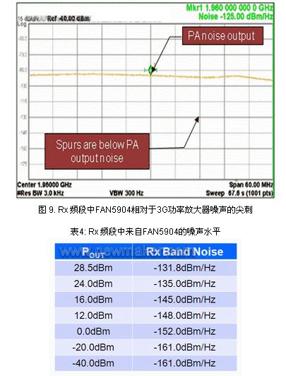 為了進(jìn)一步了解降壓轉(zhuǎn)換器帶來的噪聲/尖刺情況,根據(jù)3G功率放大器自身的噪聲輸出,對(duì)接收頻段內(nèi)的噪聲進(jìn)行了測量和比較。圖9顯示在28.5dBm的最高輸出功率下,來自FAN5904的尖刺水平實(shí)際上遠(yuǎn)遠(yuǎn)低于功率放大器的噪聲水平,表4顯示,來自FAN5904 的噪聲在-131.8dBm/Hz處最大,但仍然遠(yuǎn)遠(yuǎn)低于功率放大器自身的-90dBc。RF工程師可以放心,F(xiàn)AN5904在PWM和PFM模式工作時(shí)不會(huì)對(duì)蜂窩和其它RF頻譜的發(fā)送和接收頻段造成干擾。