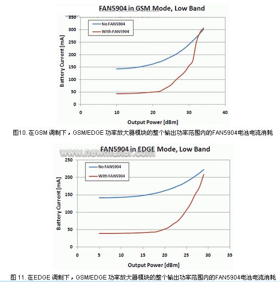 最后一個(gè)重要特性是,F(xiàn)AN5904控制GSM/EDGE功率放大器模塊的能力在于將RF功率管理解決方案從 FAN5904分離出來。在GSM/EDGE模式下,F(xiàn)AN5904具有3A的設(shè)計(jì)峰值極限電流,因而能夠控制電流高達(dá)2A的功率放大器模塊。在GSM /EDGE模式下,由于電流負(fù)載更大,F(xiàn)AN5904總是以PWM方式工作,因?yàn)镚SM和EDGE信號(hào)較3G信號(hào)具有更高的輸出功率水平,因此它以 3MHz的頻率進(jìn)行開關(guān)。3MHz是合適的開關(guān)頻率,因?yàn)樗挥赪CDMA通道帶寬之外,但是仍然可以使用小電感和小電容來處理更大電流負(fù)載,并使效率維持在高達(dá)95%的水平。人們可能要問,為什么在該模式下不使用6MHz,這在設(shè)計(jì)上是不可行的,因?yàn)檩^大的電流負(fù)載會(huì)使開關(guān)損耗更高,小型化解決方案帶來的好處在效率方面得不到補(bǔ)償。圖10和圖11顯示,在蜂窩設(shè)備處于GSM或EDGE模式下,使用FAN5904可將電流降低100mA。