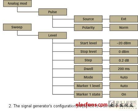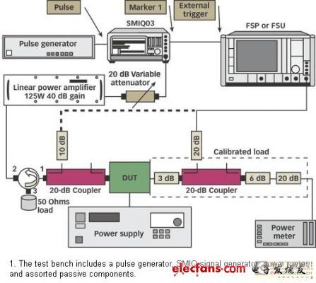 測試臺(tái)(圖1)使用一個(gè)與SMIQ RF信號發(fā)生器“脈沖”輸入相連接的脈沖發(fā)生器。為了在功率掃描模式中使用SMIQ,功率掃描必須與信號分析器中的時(shí)基掃描同步。幸好,當(dāng)與二極管檢測器和類似XY模式濾波鏡的顯示器相關(guān)聯(lián)時(shí),這一類信號發(fā)生器具有可以被用作純量網(wǎng)絡(luò)分析儀(SNA)的特性。在SMIQ的后部面板上,有幾個(gè)帶有功率掃描斜線以驅(qū)動(dòng)濾波鏡的X軸的BNC連接器,以及校準(zhǔn)顯示器X軸的標(biāo)記。既然這樣,“標(biāo)記”的輸出被當(dāng)作信號分析器的觸發(fā)信號來使用。