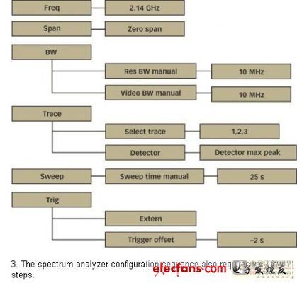 正如已經(jīng)提到的一樣,頻譜分析器在“零檔”模式下使用。不論是分辨率帶寬還是視頻帶寬,均設(shè)為10MHz,因?yàn)轭l譜分析器被用來測量峰值功率。基于同樣的理由,檢測器必須在“最大峰值”模式下設(shè)置。選取25s的掃描時(shí)間以便獲得對屏幕的整體掃描。選擇外部觸發(fā)器的可選項(xiàng)。利用“觸發(fā)器偏差”特性將屏幕上的軌跡置于中心也是一種明智的選擇。-2s即是合適的。圖3顯示了詳細(xì)的配置序列。