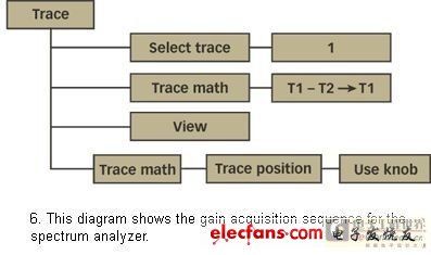 用于頻譜分析器的功能序列顯示在圖6中。線跡1設(shè)定為計(jì)算“線跡1”減去“線跡2”,后者包含了輸入功率。這樣,新獲取的輸出功率將提供一個(gè)以dB為單位的增益圖。“線跡位置”特征被用作獲得直接讀取以dB為單位的絕對增益的一個(gè)偏差。線跡偏差被設(shè)置為“輸出偏差”減去“輸入偏差”。這種情況下,“輸入偏差”在校準(zhǔn)階段被確定為30.7dB,結(jié)果得到偏差值為13dB。該值不能直接作為以dBm為單位的偏差值加入,因?yàn)?ldquo;線跡位置”清單只接受作為Y刻度百分比的輸入。旋轉(zhuǎn)鈕用來獲取與13dB偏差值相對應(yīng)的正確百分比。圖7中的藍(lán)線即為所得。
