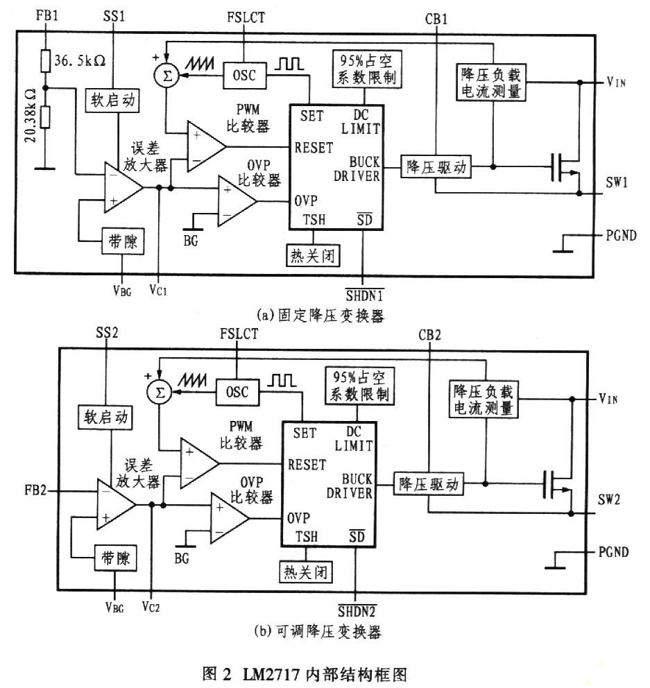 圖2所示為L(zhǎng)M2717的內(nèi)部結(jié)構(gòu)框圖。該器件有專門的保護(hù)電路,正常工作時(shí),該電路對(duì)LM2717具有保護(hù)功能。當(dāng)器件溫度過高時(shí),熱關(guān)閉電路會(huì)切斷電源。OVP比較器在電源啟動(dòng)和關(guān)閉期間保護(hù)電源裝置,防止器件在最小輸入電壓下工作。OVP比較器被用來防止輸出電壓在沒有負(fù)載情況下上升,允許在滿載條件下的全脈寬調(diào)制(PWM)。當(dāng)電源電流達(dá)到10μA時(shí),該器件會(huì)使變換器工作在關(guān)閉模式。