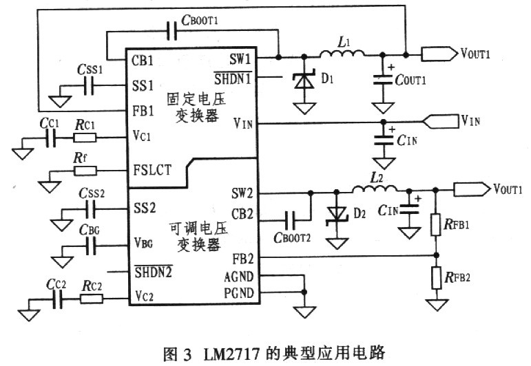 圖3所示是LM2717的典型應(yīng)用電路。圖中,VIN是整個(gè)應(yīng)用電路的電壓輸入端,VOUT1是固定降壓變換器的電壓輸出端,VOUT2是可調(diào)降壓變換器的電壓輸出端。CIN、Coot、CSS、CBOOT、L分別是輸入電容器、輸出電容器、軟啟動(dòng)電容器、自舉電容器、電感,這幾個(gè)元件在設(shè)計(jì)時(shí)應(yīng)著重考慮。這里主要介紹利用該電路進(jìn)行設(shè)計(jì)時(shí)一些主要外元件的選擇原則及需注意的問題。