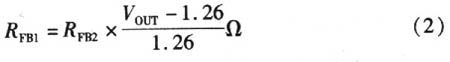 輸出電壓是依據(jù)反饋引腳和連接到輸出端的電阻分壓器設(shè)計(jì)的,如圖3所示。反饋引腳的電壓是1.26 V,因此根據(jù)式(2),由反饋電阻比來設(shè)計(jì)輸出電壓: