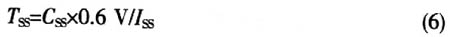 該器件無允許快速啟動(dòng)的內(nèi)部軟啟動(dòng),但是也會(huì)產(chǎn)生大的浪涌電流。因此,對(duì)于需要降低浪涌電流的應(yīng)用,該器件有限制DC/DC轉(zhuǎn)換調(diào)節(jié)器啟動(dòng)時(shí)浪涌電流的電路。浪涌電流限制電路可作為軟啟動(dòng)。外部的SS引腳用來調(diào)節(jié)軟啟動(dòng)的特殊應(yīng)用。電流ISS影響外部軟啟動(dòng)電容器CSS,軟啟動(dòng)時(shí)間計(jì)算為: