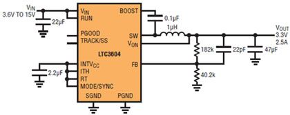 LTC3601 和 LTC3604 是高性能單片同步降壓型穩(wěn)壓器,分別能提供高達(dá) 1.5A 和 2.5A 的電流。這兩款器件在 3.6V 至 15V 的寬輸入電壓范圍內(nèi)工作,這樣的范圍涵蓋了手持式設(shè)備、PC 以及汽車中使用的電池化學(xué)組成。它們獨(dú)特的恒定頻率 / 受控接通時(shí)間架構(gòu)提供 20ns 的最短接通時(shí)間,非常適用于需要高開關(guān)頻率和快速瞬態(tài)響應(yīng),同時(shí)能保持高效率的高降壓比應(yīng)用。