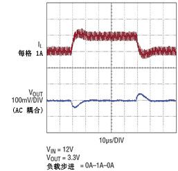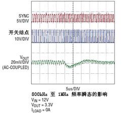 有些應(yīng)用在工作時(shí)要求移動(dòng)開關(guān)頻率,通常是為了避開相鄰無線接收器的干擾。圖 3 顯示了甚至當(dāng) MODE/SYNC 引腳引入的同步頻率迅速變化時(shí),輸出電壓的偏離也是很小。