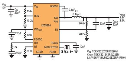 很多微處理器都需要 1.x 的低電壓軌,但是它們也用于需要高開關(guān)頻率的應(yīng)用中,這類應(yīng)用以高開關(guān)頻率保持采用外型很小的無源組件、并使關(guān)鍵頻段避開 RF 干擾。問題是,要實(shí)現(xiàn)高降壓比和高開關(guān)頻率這不可思議的組合可能是難以捉摸的,因?yàn)樾枰@么短的最短接通時(shí)間。圖 5 顯示 LTC3604 用在一個(gè) 4MHz、12V 至 1.8V 應(yīng)用中的原理圖。這個(gè)應(yīng)用要求的 38ns 接通時(shí)間遠(yuǎn)大于 LTC3604 的 20ns 最短接通時(shí)間。