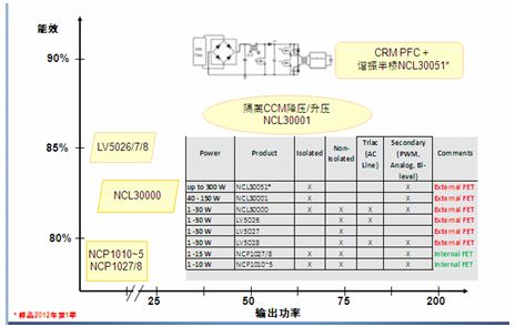 在安森美半導體用于LED照明的AC-DC電源方案中,1至10 W的照明應用中推薦使用NCP1010~5,1至15 W可使用NCP1027/8,這些方案集成了MOS管,適用于隔離和非隔離應用,支持次級PWM調光、模擬調光或雙亮度等級調光,能效高達75-80%;1至30 W的應用可以使用LV5026、5027、5028,支持隔離方案,典型能效85%左右;1至40 W推薦使用NCL30000,可進行初級可控硅調光,適用于隔離和非隔離方案,隔離方案能效80-85%。40至150 W推薦使用NCL30001,它是一個連續(xù)導電模式(CCM)控制芯片,隔離方案的典型能效85-90%;更大功率推薦使用NCL30051。圖2是這些方案輸出功率與能效的對比。以下將具體介紹這些方案的功能和特點。
