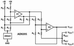 AD8205的內(nèi)部電路由A1和A2兩個集成運放和一個電阻網(wǎng)絡,以及一個小參考電壓源和偏置電路構成,其電路結構如圖1所示。