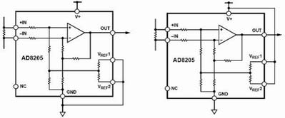 雙極性輸出時AD8205可以測量流過采樣電阻上的雙向電流,這時,輸出可以偏置到輸出范圍內(nèi)的任意位置。當被檢測的正反兩個方向上的電流為等幅時,其輸出必須偏置到滿量程輸出的中間位置。當雙向電流幅值不對稱時,輸出偏置可以對應地偏離半量程位置。它的兩個參考輸入VREF1和VREF2分別連接一個內(nèi)部電阻RREF后接到同一個內(nèi)部偏置節(jié)點,這兩個參考輸入端的操作方式完全相同。在兩個參考電壓輸入端接入對應的電壓,即可完成對輸出的偏置。在雙極性輸出方式下,一般有以下兩種連接方式。