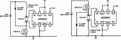 如圖4(b)所示連接,PWM開關和采樣電阻都位于電壓高側。當PWM開關打開時,負載電源將被移除,但仍然可以提供和監(jiān)測續(xù)流電流,以實現(xiàn)電流控制診斷。在工作過程中,大部分時間電源都和負載隔離,這樣可將負載對地之間的差分電壓所引起的不良影響減到最小。當PWM開關閉合時,電源電壓將連接到負載,這時共模電壓將增加到電源電壓。而PWM開關打開時,電壓將反轉并經(jīng)過感性負載,由于續(xù)流二極管的作用,使得采樣電阻上的共模電壓保持為一個低于地的二極管的導通壓降。