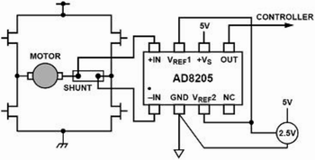 如圖5所示連接,AD8205在H橋馬達控制電路中作為控制回路的一部分,馬達和采樣電阻串連后放置在H橋的中間,通過檢測采樣電阻上的電壓,可以準確地測量馬達當前的電流及其方向。此時,AD8205的輸出被設定成外部參考雙向的方式,這樣它可以測量H橋開關的雙向電流并同時監(jiān)測馬達的運轉方向。由于地不是一個特別穩(wěn)定的參考電平,以地為參考將會導致測量的不準確性。因此,這種測試方案要比以地作為參考電平的測試方法好的多。