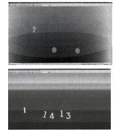 在進(jìn)行圖像尺寸測量時(shí),需要將經(jīng)過計(jì)量或已知精確尺寸的試件緊貼在被檢焊縫的一側(cè)與焊縫同時(shí)成像。每次評定前,應(yīng)作一次標(biāo)定,缺陷測量時(shí)進(jìn)行對比或通過公式將圖像尺寸轉(zhuǎn)化為真實(shí)尺寸。為此,設(shè)計(jì)了專用的測量評片用試片(圖3),試片也可用于檢測相對運(yùn)動速度是否匹配。