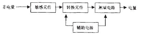傳感器是將各種非電量(包括物理量、化學量、生物量等)按一定規(guī)律轉(zhuǎn)換成便于處理和傳輸?shù)牧硪环N物理量(一般為電量)的裝置。傳感器一般由敏感元件、轉(zhuǎn)換元件和測量電路三部分組成,有時還需外加輔助電源。 傳感器方框圖如圖1所示。