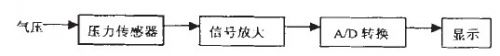 下面以測量輪胎氣壓為例詳細闡述氣壓傳感器在汽車輪胎方面的應(yīng)用。此種設(shè)計可做成一種便攜式的裝置,測量時將氣壓傳感器的表置于輪胎氣門嘴上,這時胎壓作用于傳感器的膜片上,通過壓阻效應(yīng)和系列變換輸出微弱的電壓信號,將電壓信號進行相應(yīng)處理顯示電壓值。由此可知不同的氣壓對應(yīng)著不同的電壓值,即氣壓值和電壓值是一一對應(yīng)的,從而間接測量了氣壓值。胎壓測量電路方框圖如圖4所示。