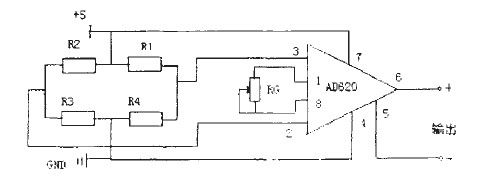 我們選用的高精度低噪聲儀用放大器AD620,可以用在傳感器輸出信號小的放大器中,如光電池傳感器、應(yīng)變片傳感器以及壓力傳感器等。由于它具有低噪聲、增益精度高、增益溫度系數(shù)小和高線性度等優(yōu)良性能。用于此系統(tǒng)中是非常理想的。AD620是一種只用一個外部電阻就能設(shè)置放大倍數(shù)為1-1000的儀表放大器,具有良好的直流性能和交流性能,AD620的體積小、功耗低成為應(yīng)用在壓力傳感器中的重要因素,傳感器信號放大電路如圖5所示。