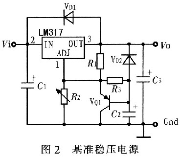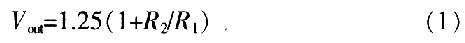 LM317是美國國家半導體公司的三端可調正穩(wěn)壓器集成電路,輸出電壓范圍是1.2~37 V,負載電流最大為1.5 A,使用簡單。其工作過程如下:輸出電壓Vout通過R1、VQ1,對C2充電,開始時VQ1飽和導通,Vout最低(約1.5 V)。隨著C2上電壓的升高,VQ1逐漸退出飽和并趨于截止,Vout逐漸升高至額定電壓。改變R1、C2的常數(shù)可改變軟啟動的時間。改變可變電阻R2的值,可調整輸出電壓Vout的值。VD1用于關機后使C2上的電荷快速泄放。其輸出電壓為:
