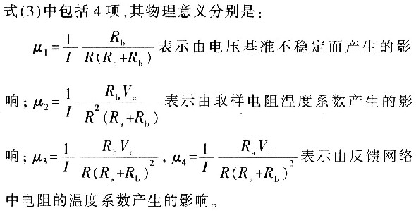 由于選取的取樣電阻R為歐姆級,而(Ra+Rb)為數(shù)十千歐姆級,因此有:μ2>μ1>μ3≈μ4,這說明影響輸出電流穩(wěn)定度的主要因素是取樣電阻的溫度系數(shù)和電壓基準的穩(wěn)定度。在本恒流源中,選用取樣電阻精度是0.1%,溫度系數(shù)是±2.5×10-5/℃,電壓基準的溫度系數(shù)小于1×10-6/℃。